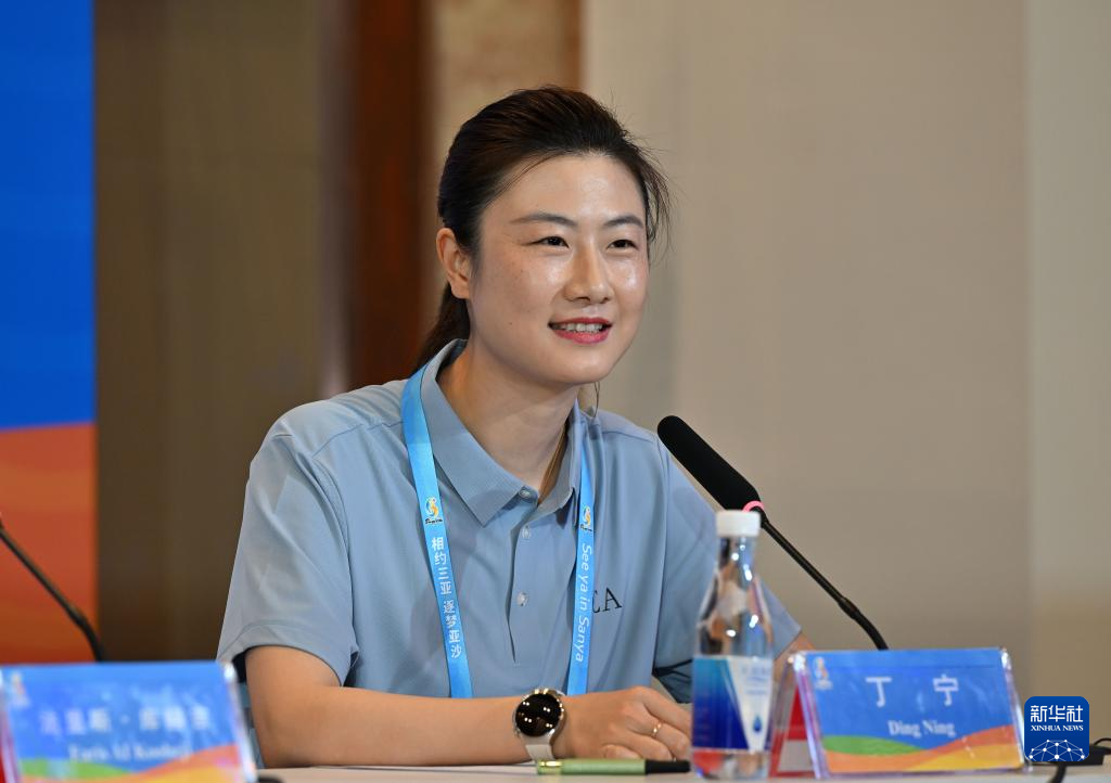 4月23日,亚奥理事会运动员委员会主席丁宁在新闻发布会上发言。新华社记者 郭程 摄