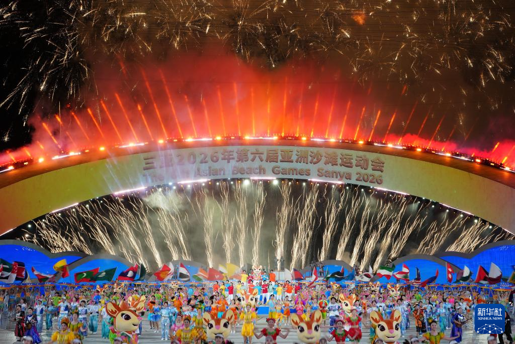 20时45分,中华人民共和国国务委员谌贻琴宣布:三亚2026年第六届亚洲沙滩运动会开幕!瞬时,场内旗帜翻飞,场外烟花漫天。