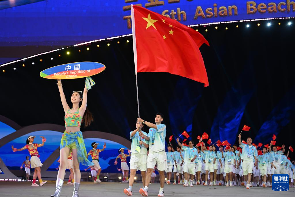 耀眼“中国红”来了!沙滩手球运动员沈萍和三人篮球运动员颜鹏带领中国体育代表团入场。此次中国代表团共派出255人,包括171名运动员,将参加除沙滩卡巴迪外13个大项、60个小项的比赛,是我国参加亚沙会以来参赛率最高的一届。