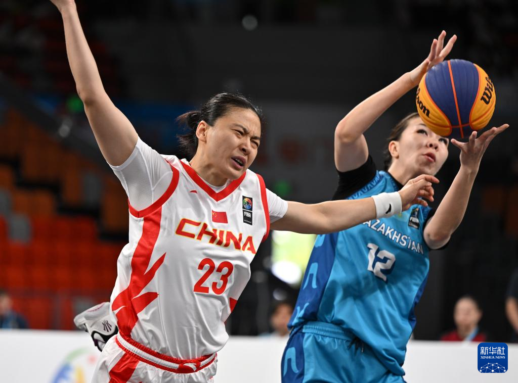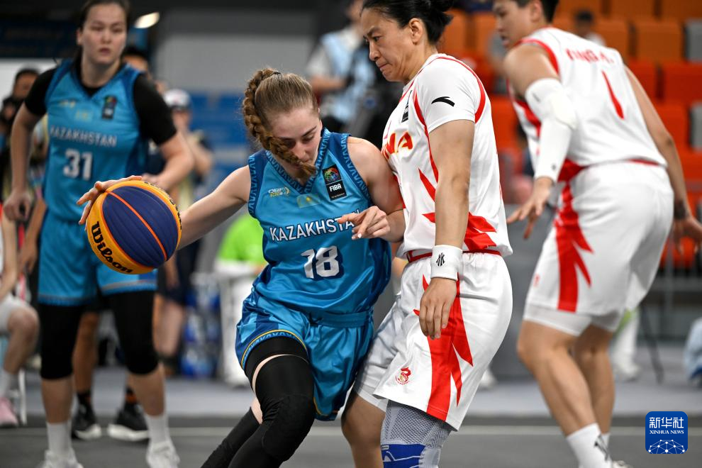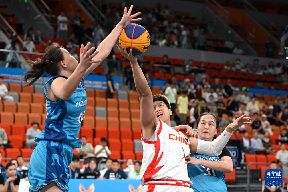 4月25日,哈萨克斯坦队球员莉娅·乌梅罗娃(前左)在比赛中突破。新华社记者 郭程 摄