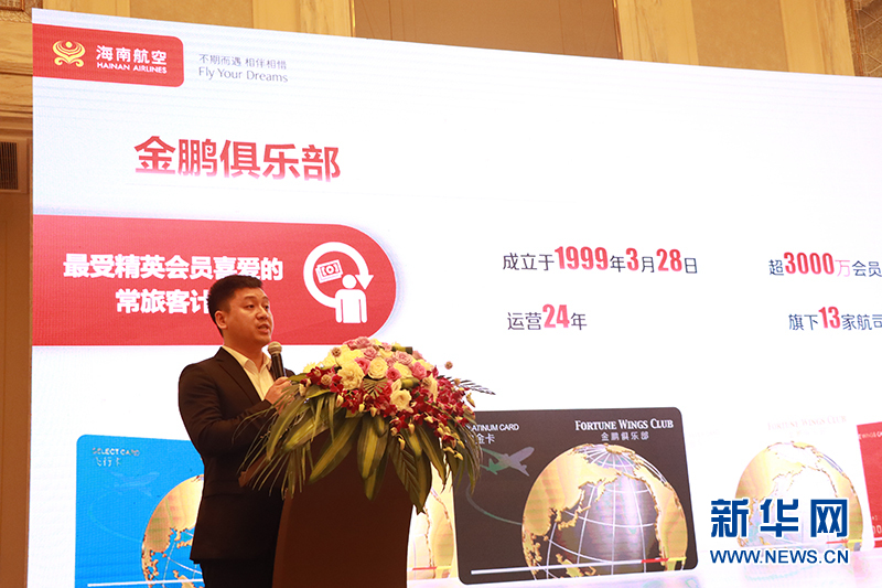 海航航空金鹏俱乐部总经理巩专宾介绍金鹏俱乐部24周年庆活动。新华网发