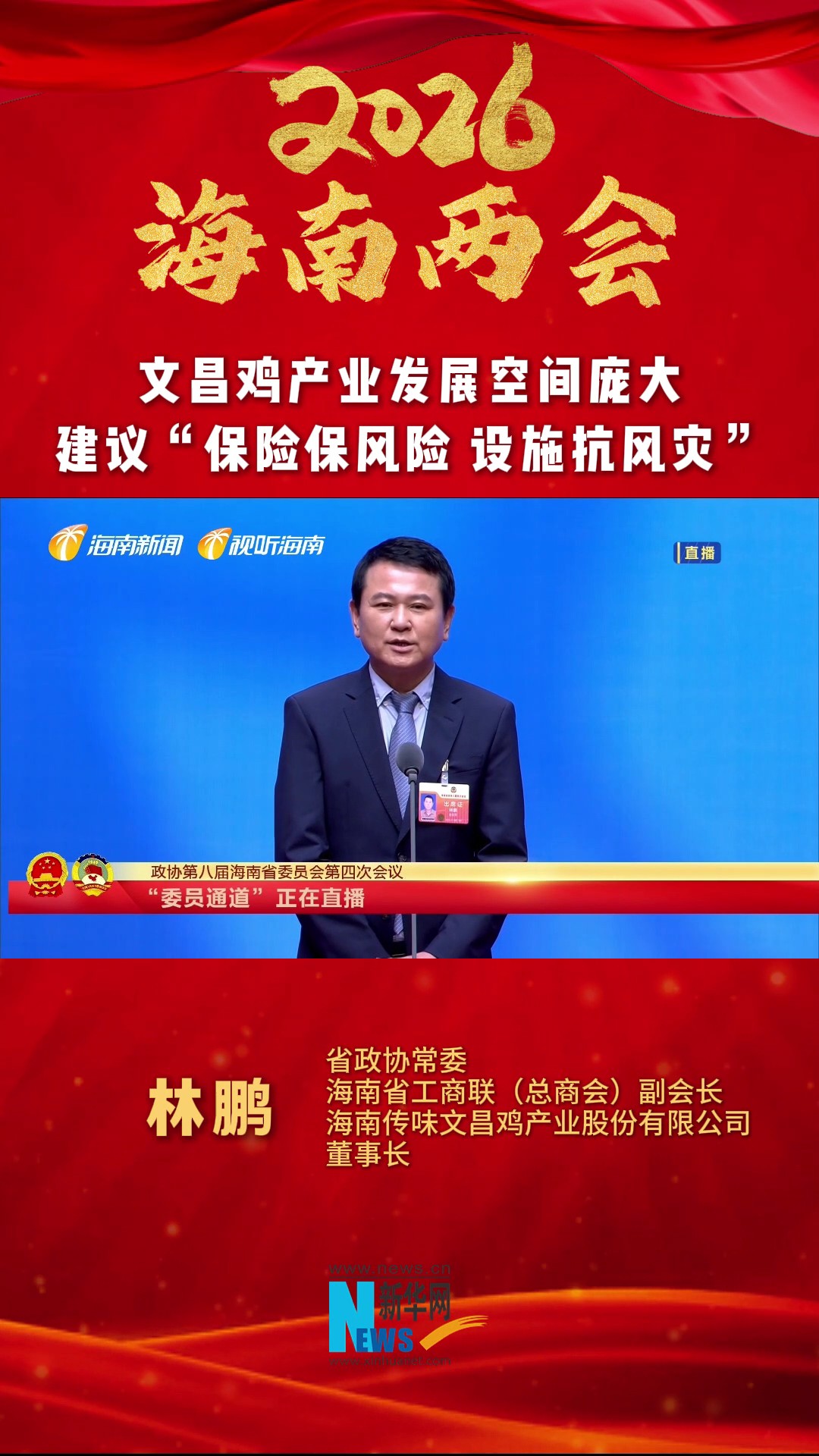 海南两会代表委员通道|林鹏:文昌鸡产业发展空间庞大 建议“保险保风险 设施抗风灾”