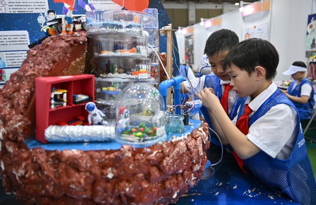 新华社海口8月16日电(记者陈凯姿、袁睿)宝塔形的小火箭和张开“双翼”的卫星整齐地排在一侧,几艘小飞船正在缓缓降落,来自四川的一年级学生赵乐晞正在和同伴向评委介绍“太空停车场”。