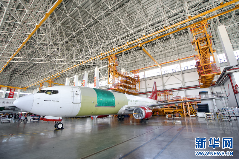 冰岛进境飞机正接受起落架更换、蒙皮检测、结构深度维修等检修项目。新华网发