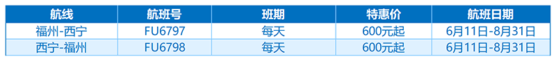 根据航班计划,福州=西宁航线航班号为FU6797/FU6798,每日执飞一班。航线单程票价600元起,为暑期探亲、旅游提供高性价比选择。