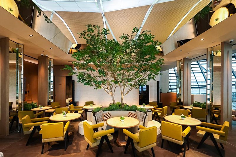 此次揭幕的上海海翼轩贵宾厅是由海南航空与洲际酒店集团联名打造。整体空间布局有序,前区设有布菲岛台、自助取餐区及互动烹饪区;后区则设有用餐与舒适的休息区域。贵宾厅中央融合酒店式的“后花园”空间理念,将酒店体验延伸至机场贵宾厅,丰富空间层次与使用感受。