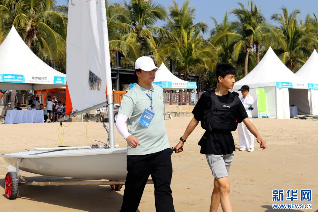 参赛选手在帆船测试赛比赛现场准备进行赛前测试。新华网发(王康宏 摄)