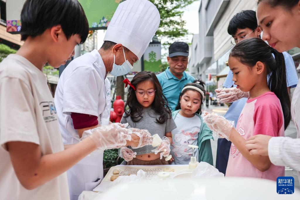 3月21日,市民在海南海口非遗市集上体验制作琼式月饼。新华社记者 张丽芸 摄