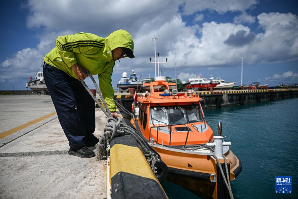 3月19日,在海上交通保障船抵达海南三沙永兴岛码头后,工作人员整理缆绳准备固定船只。新华社记者 蒲晓旭 摄