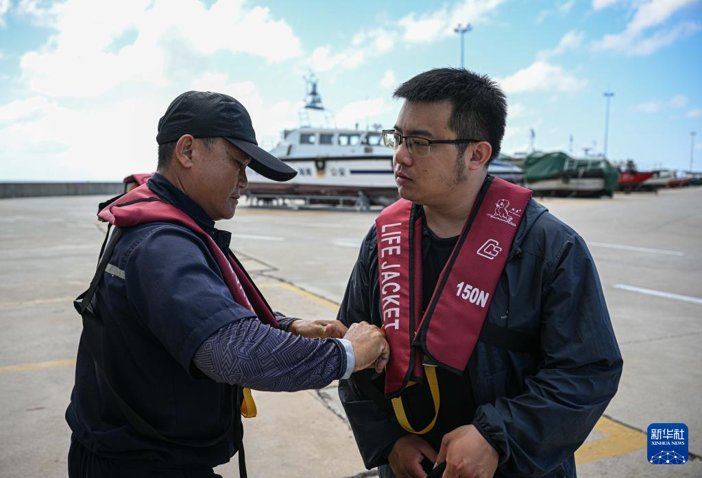 3月19日,海上交通保障船工作人员(左)协助乘客穿戴救生衣。新华社记者 蒲晓旭 摄