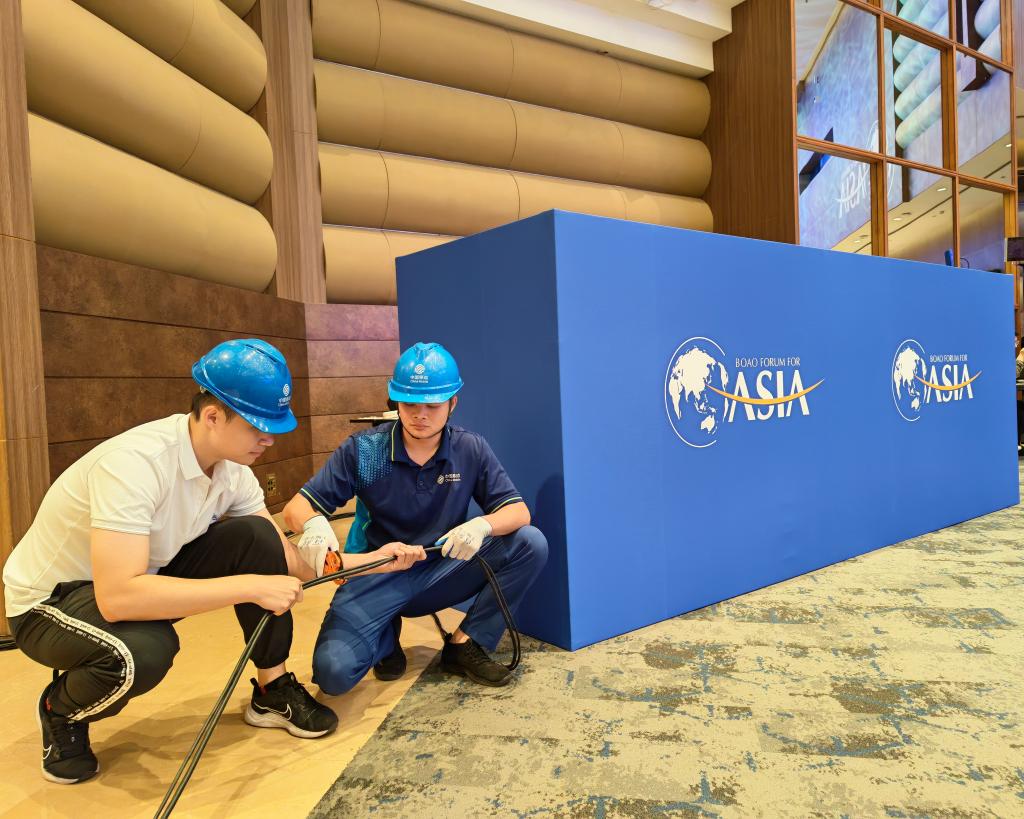 工作人员在博鳌亚洲论坛国际会议中心进行5G室分覆盖增补。