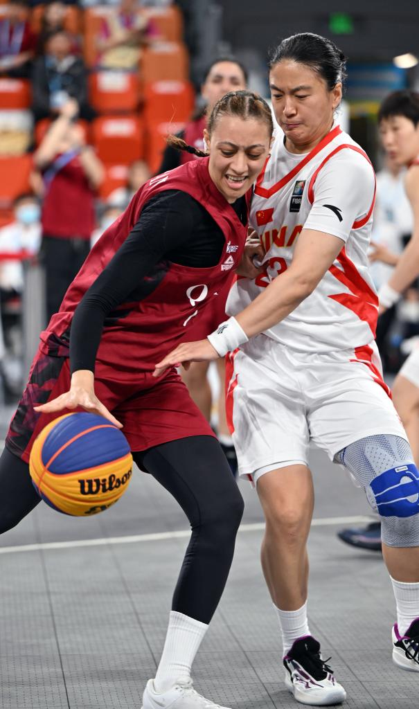 4月25日,中国队球员王丽丽(右)在比赛中防守卡塔尔队球员莫娜·赛义德。新华社记者 郭程 摄