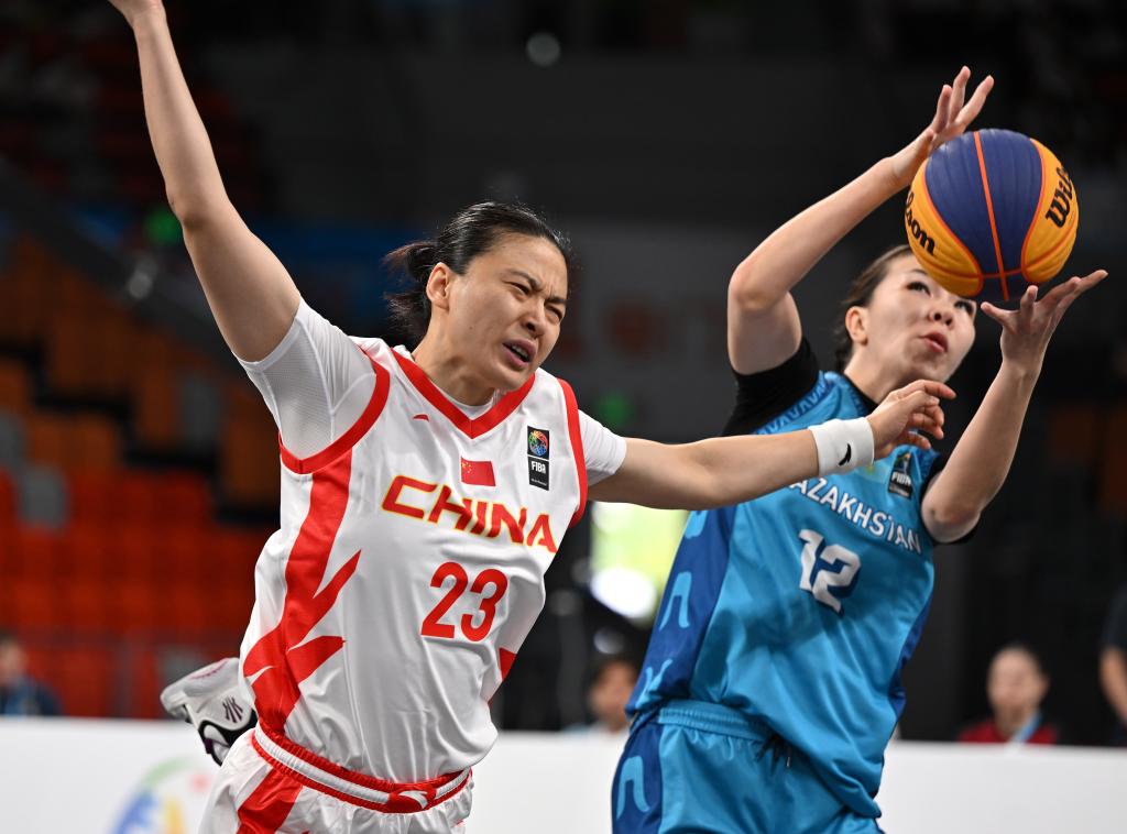 4月25日,中国队球员王丽丽(左)在对阵哈萨克斯坦队的比赛中拼抢。新华社记者 郭程 摄