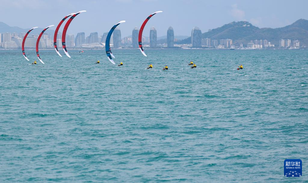 4月27日,第六届亚洲沙滩运动会帆船项目水翼风筝板男子公开系列赛在海南三亚举行。新华社记者 胡星宇 摄