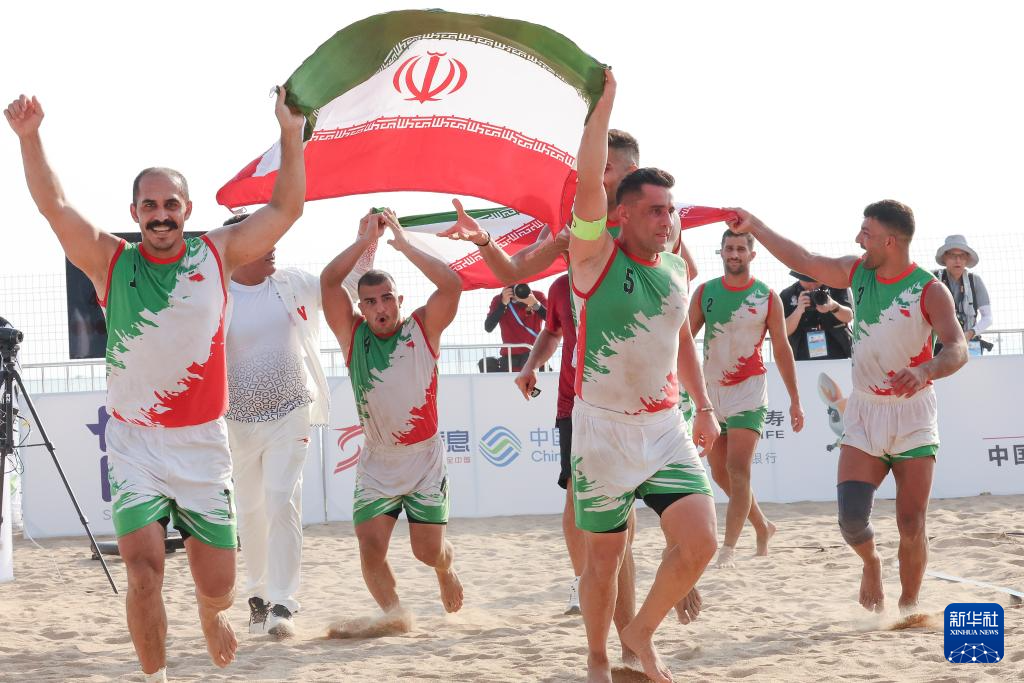 4月27日,伊朗队在赢得沙滩卡巴迪男子组冠军后庆祝胜利。新华社记者 朱唯希 摄