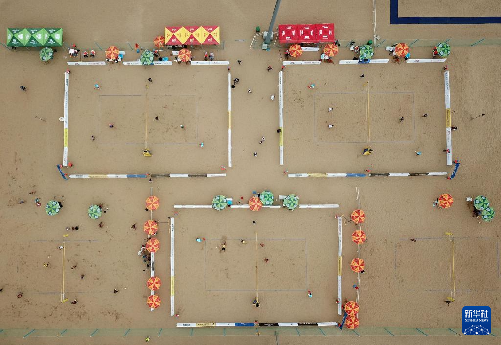 2018年7月19日,2018国际排联世界沙滩排球巡回赛海阳公开赛在山东海阳进行(无人机拍摄)。新华社记者 朱峥 摄